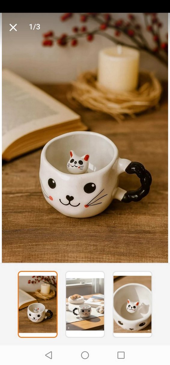 Beyaz seramik kupa, sevimli kedi yüzü ve içinde küçük kedi figürü bulunur. Kulpu kedi kuyruğu şeklindedir.