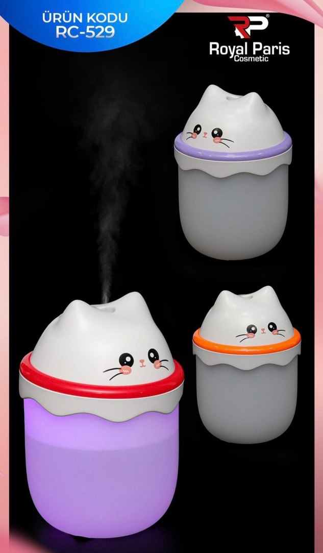 Pastel beyaz ve renkli detaylara sahip sevimli kedi tasarımlı nemlendirici, havayı nemlendirir ve konfor sağlar.