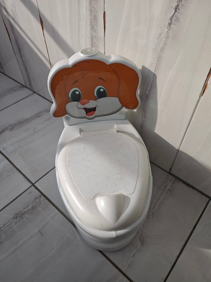 Sevimli köpek figürlü, beyaz renkli bebek tuvaleti. Küçük çocuklar için tuvalet eğitimi amacıyla kullanılır.