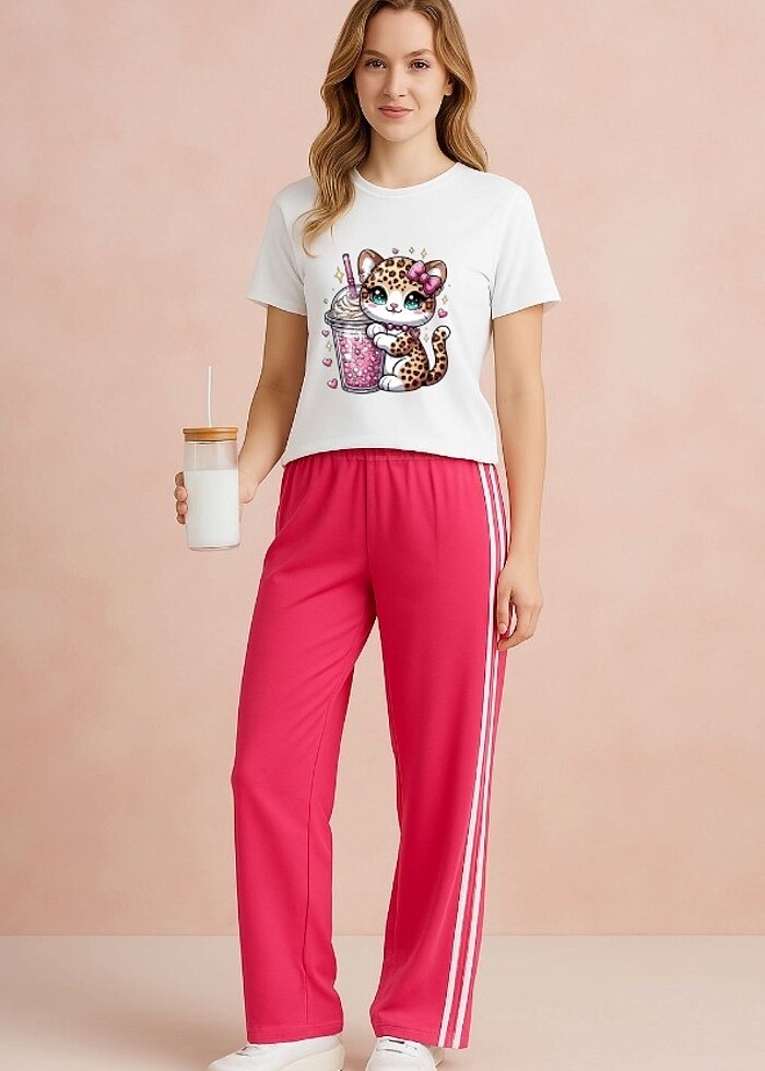 Sevimli baskılı kısa kollu tişört Elastik bel yapısıyla rahat eşofman altı Cıvıl cıvıl renkler ve dikkat çekici tasarım Günlük kullanım ve evde konfor için mükemmel seçim