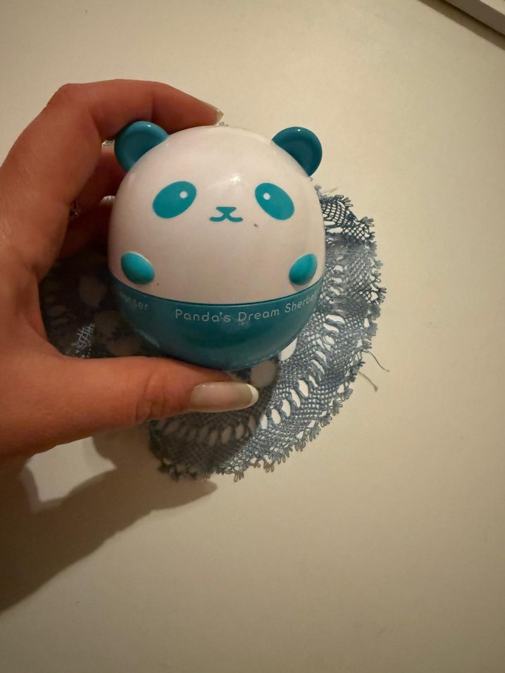 Mavi beyaz renklerde, sevimli panda şeklinde bir kutuda el kremi. Ellerinizin nemlenmesini ve korunmasını sağlar.