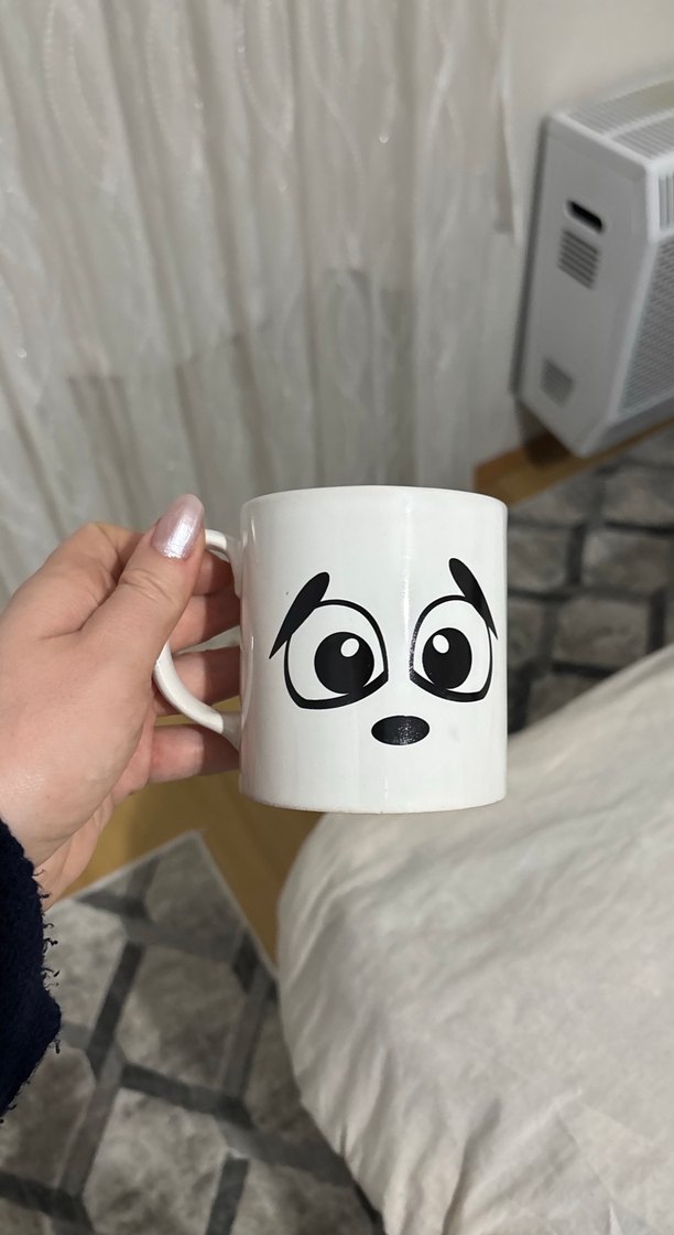 Geniş gözler ve küçük burunlu sevimli yüz desenine sahip beyaz seramik kupa. ☕