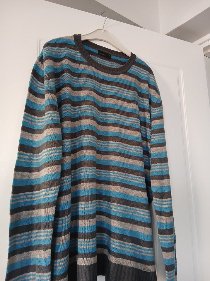 Gri ve mavi tonlarında çizgili, örgü yün erkek kazak. Uzun kollu, yuvarlak yakalı, bol kesim ve günlük kullanıma uygun normcore tarzında. kol altı 62 boy 62 tülerme yok temiz
