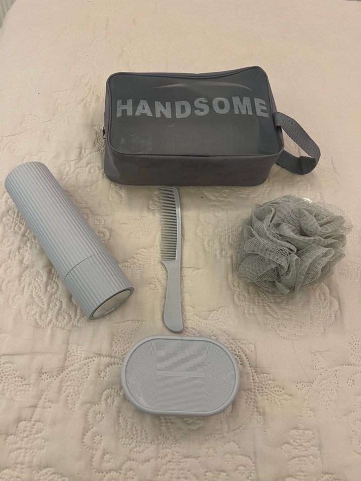İçinde banyo lifi , tarak,sabun kutusu,diş bakım kutusu ve saklama çantasıyla kullanılmamış üründür.