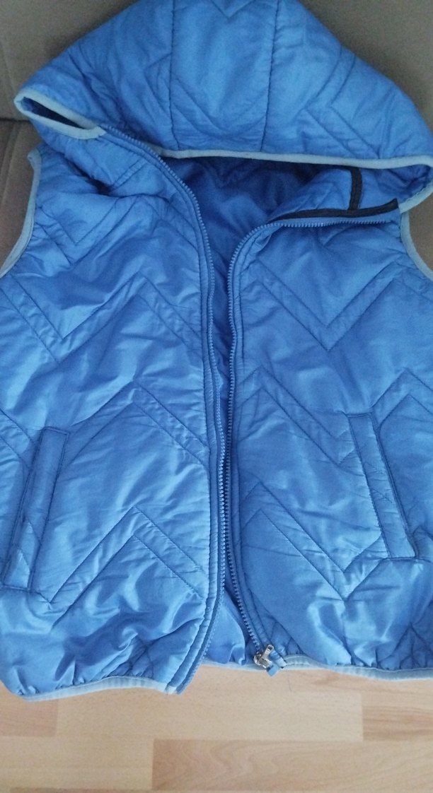 Fermuarlı, mavi erkek çocuk yeleği, yakalı ve kolsuzdur. Sokak stiline uygun, yumuşak ve sıcak kumaştan yapılmıştır. Düz desene ve gri detaylara sahiptir.