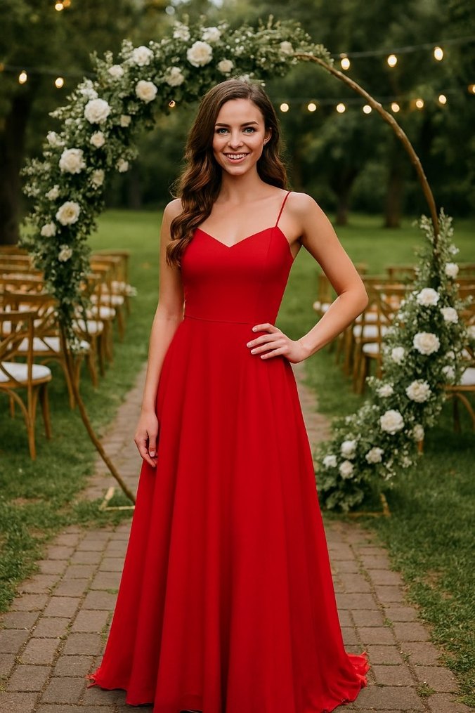Uzun kırmızı elbise, V yakalı ve ince askılıdır. Drapeli tasarımı ve parlak dokusuyla modern klasik şıklık sunar.