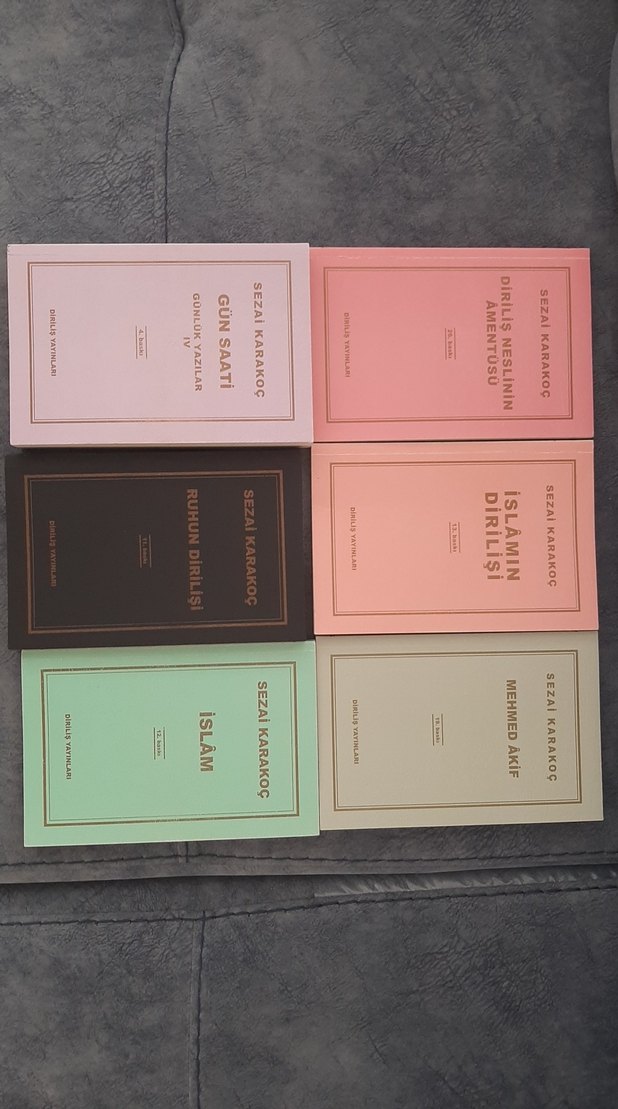 Sezai Karakoç'un 'İslam', 'Ruhun Dirilişi', 'Mehmed Akif' ve diğer kitaplarından oluşan 6 kitaplık set. Pastel ve koyu tonlarda sade kapaklar.
