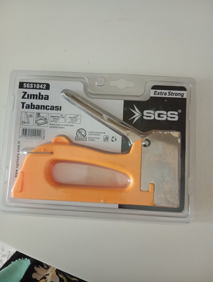 SGS Extra Strong zımba tabancası, turuncu saplı ve dayanıklı metal gövdelidir. Güçlü zımbalama için uygundur ve SGS1042 model numaralı yedekleme seçeneği bulunur. kumaş zımbası