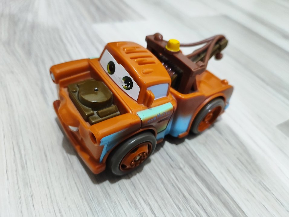 Renkli kahverengi oyuncak araba, animasyon karakterini andıran gözler ve detaylı tasarıma sahiptir.