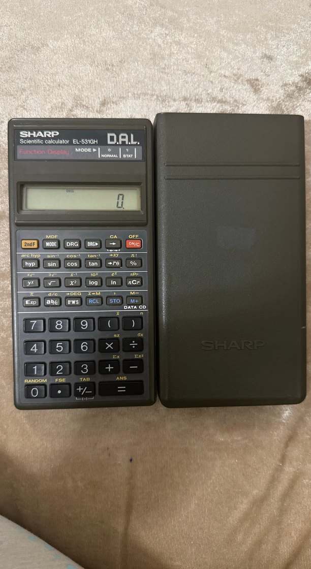 Bej renkte Sharp EL-5310H bilimsel hesap makinesi, koruyucu kapaklı. Çok sayıda bilimsel fonksiyon ve net dijital ekran bulunur. Model D.A.L EL-5310.