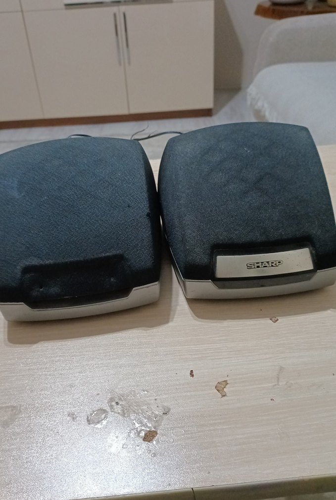 Sharp müzik sistemi hoparlörleri, 16 ohm 10 watt hoporlör çok uzun kablosu vardır 2 adettir değişik araçlara takılabilir birtanesinin logosu düşmüştür..temiz çalışır durumda