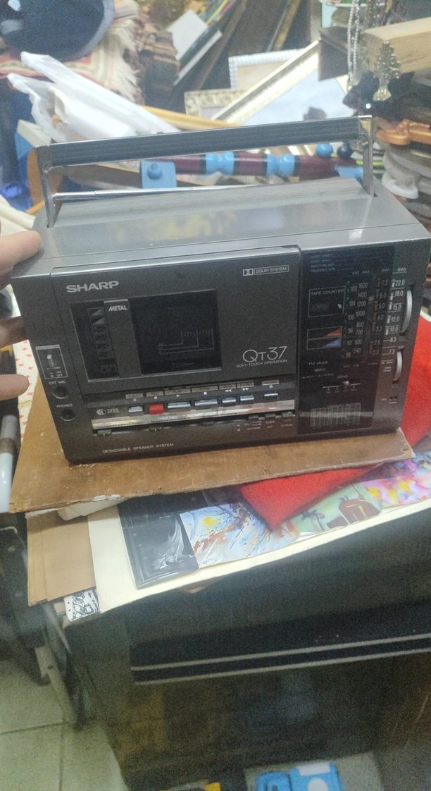 Sharp QT37 gri renkli müzik sistemi, kaset çalar, radyo alıcısı ve taşıma kolu ile birlikte gelir. Çoklu kontrol düğmeleri ve frekans göstergesi bulunur.