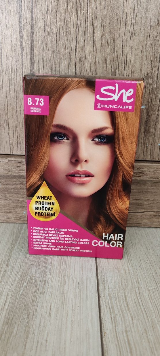 She Huncalife 8.73 karamel saç boyası, buğday proteini ile besleyici bakım ve maksimum kapama sağlar. Yoğun ve kalıcı renk verir.