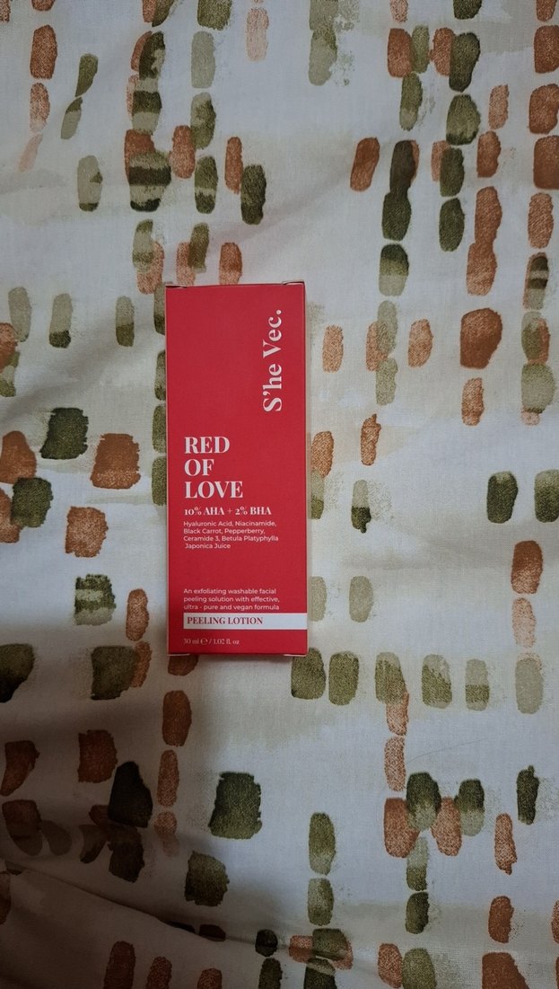 She Vec. Red of Love peeling losyon, AHA ve BHA içeren, cildi yenileyici ve besleyici bir bakım sunar. Niacinamide ve seramid içerir.