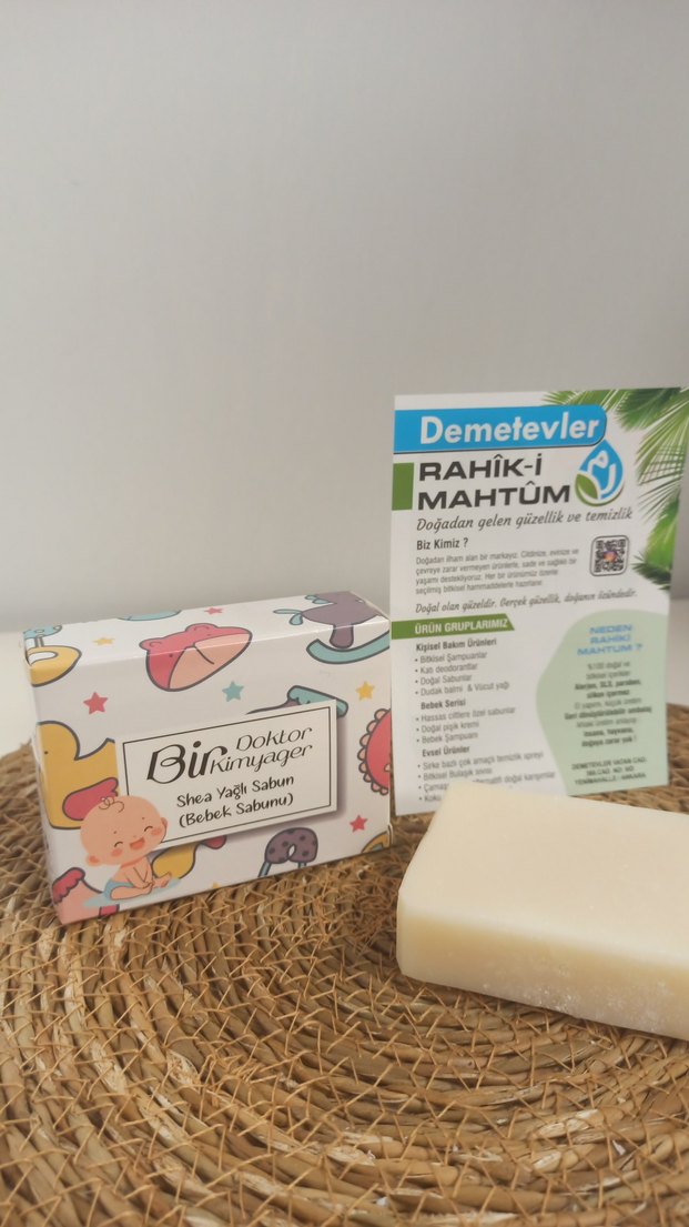Hassas ciltler için shea yağlı, nazik temizleyici özelliklere sahip bebek sabunu.