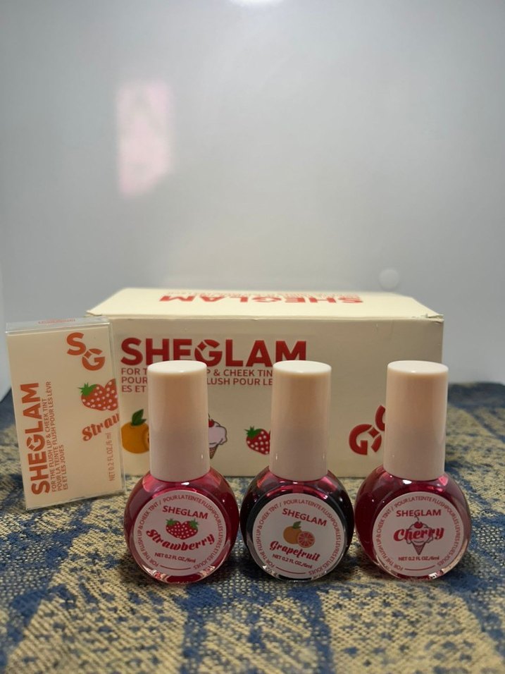 SHEGLAM markalı, çilek, greyfurt ve kiraz renklerinde canlı pembe tonlarında üçlü oje seti.