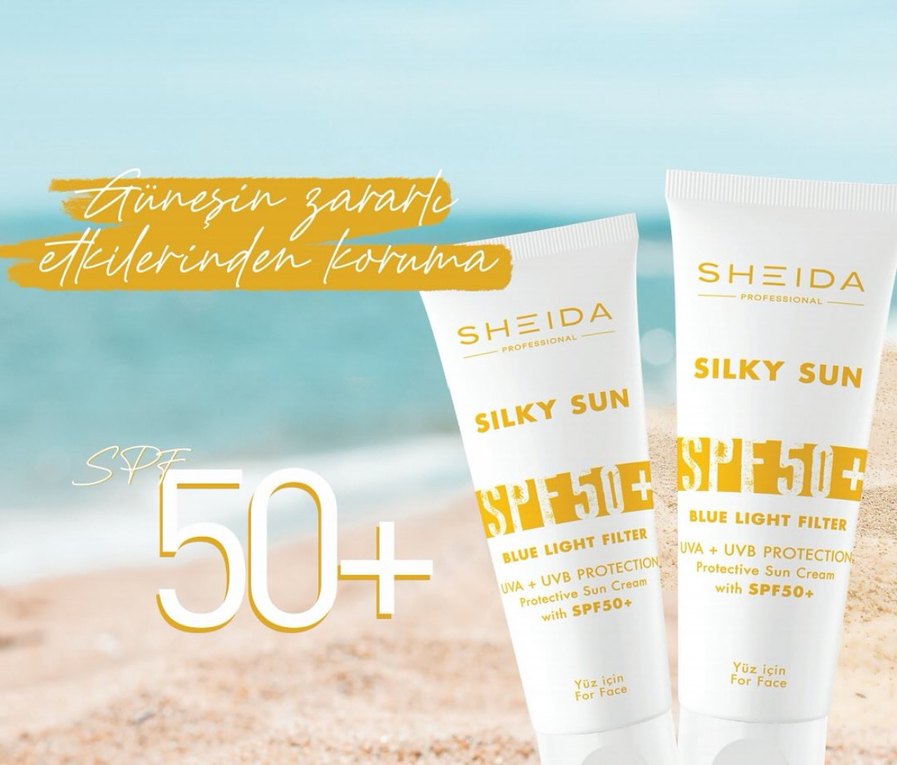 Sheida Silky Sun SPF 50+ yüz kremi, UVA, UVB ve mavi ışığa karşı koruma sağlar, ipeksi dokuludur.