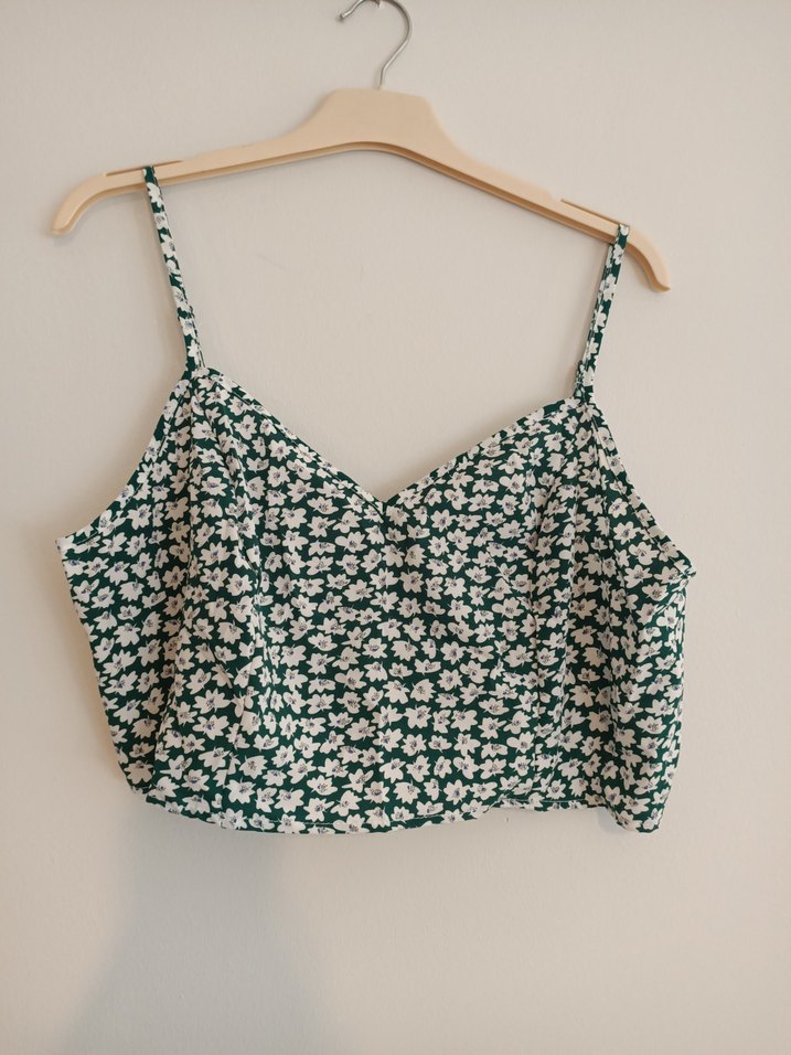 Yeni hiç giyilmedi, askılı mini crop top. Yeşil renkli çiçek desenli, bol kesim bohem tarzı.