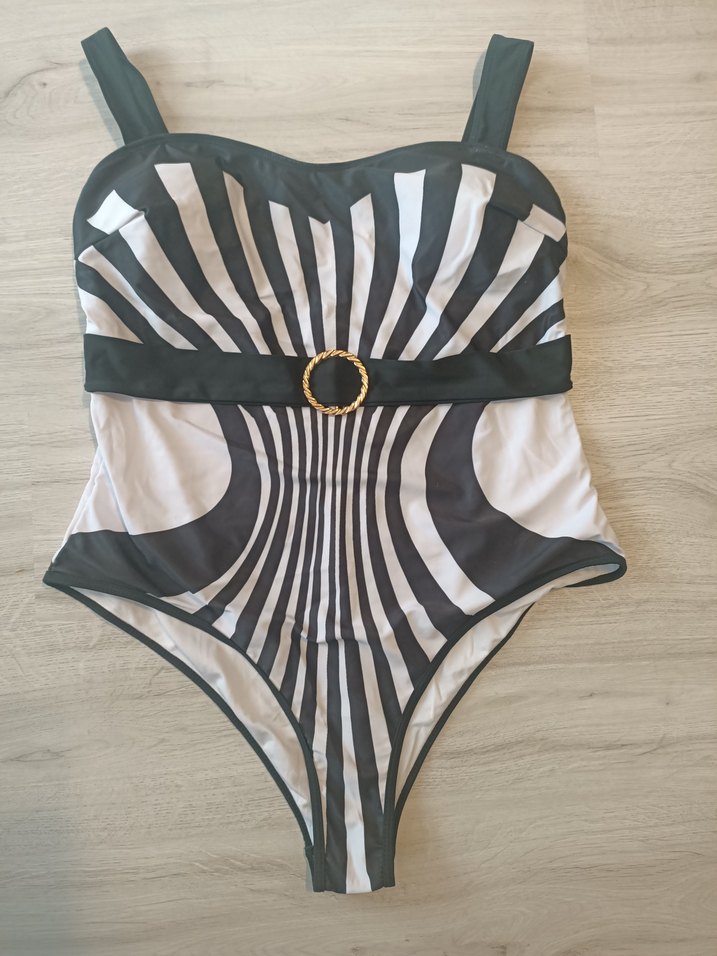 Kusursuz, göğüs kısmı çıkarılabilir pedlidir..Siyah ve gri zebra desenli, kemerli ve askılı, vücuda oturan kadın mayo. Çağdaş plaj stili için ideal.