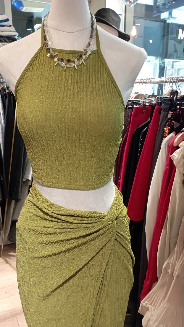 Ürün yeni,Haki renkte, drapeli ve fit kesim kadın triko takım elbise. Askısız ve kolsuz, parti için uygun.Defo,sökük,leke yoktur.