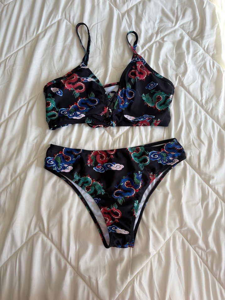 Çok renkli yılan deseniyle, askılı ve tokalı detaylara sahip, kısa ve vücuda oturan kadın bikini. Bir kez giyildi