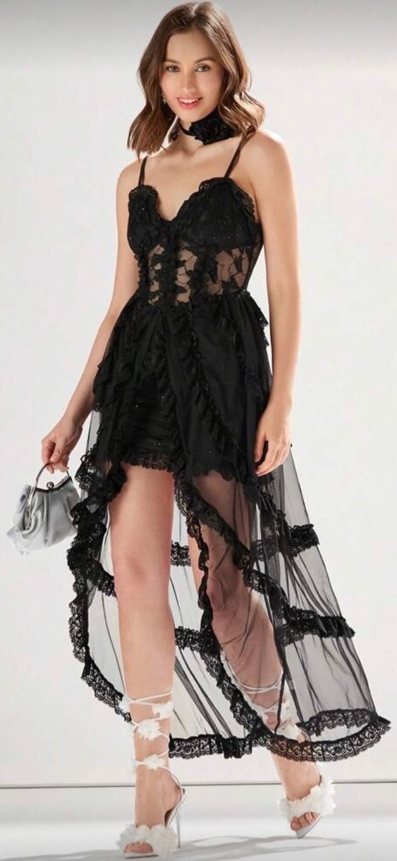 Dantel işlemeli, straplez ve askılı uzun siyah abiye elbise, vücuda oturan kesimiyle parti için uygundur.