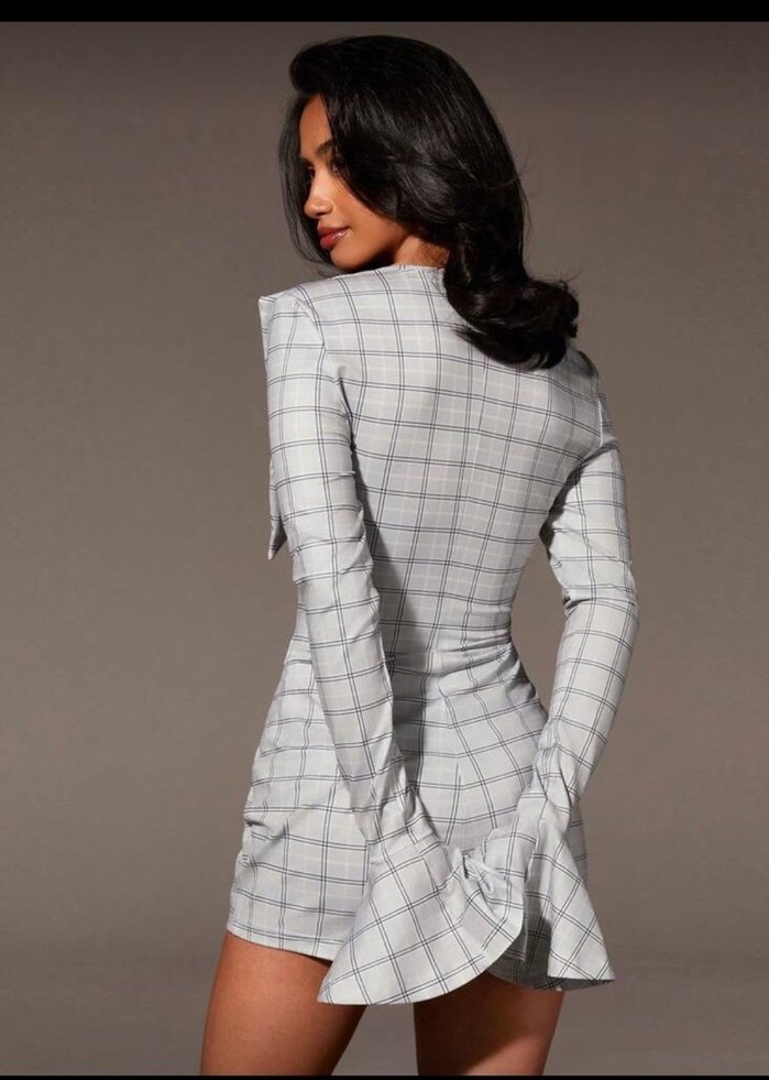 V yaka ve uzun kollu, gri ekose desenli kadın takımı. Sentetik kumaştan, pilili detaylı ve mini boyda, ofis için uygun cesur bir tasarım.