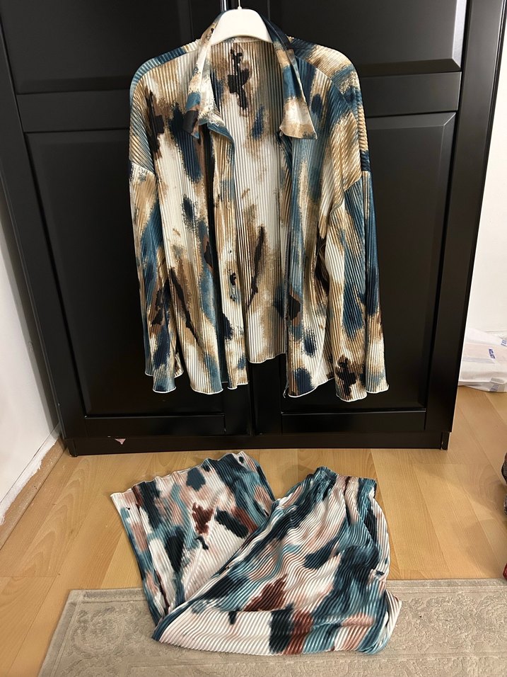 Kadınlar için uzun kollu, bol kesim pliseli tekstil takımdır. Koyu tonlarda tie-dye desenli, camel renkli bohem tarzda günlük kullanıma uygundur. Straplez yaka detaylıdır.