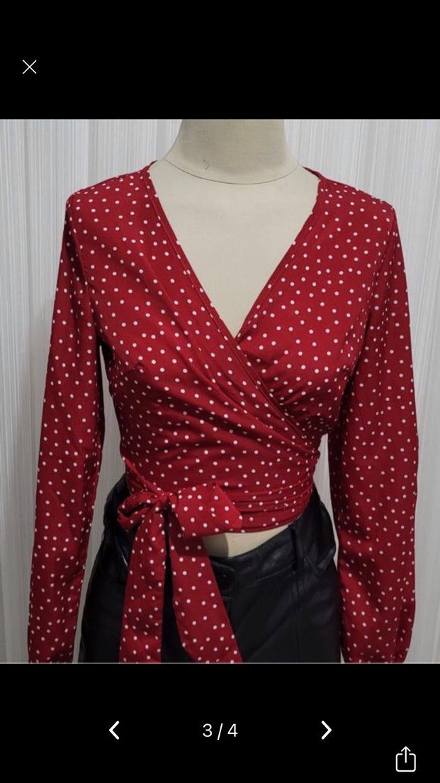 Kırmızı puantiyeli, V yakalı, kuşaklı ve uzun kollu dar kesim bluz. Sentetik kumaştan, günlük sokak tarzına uygun.
