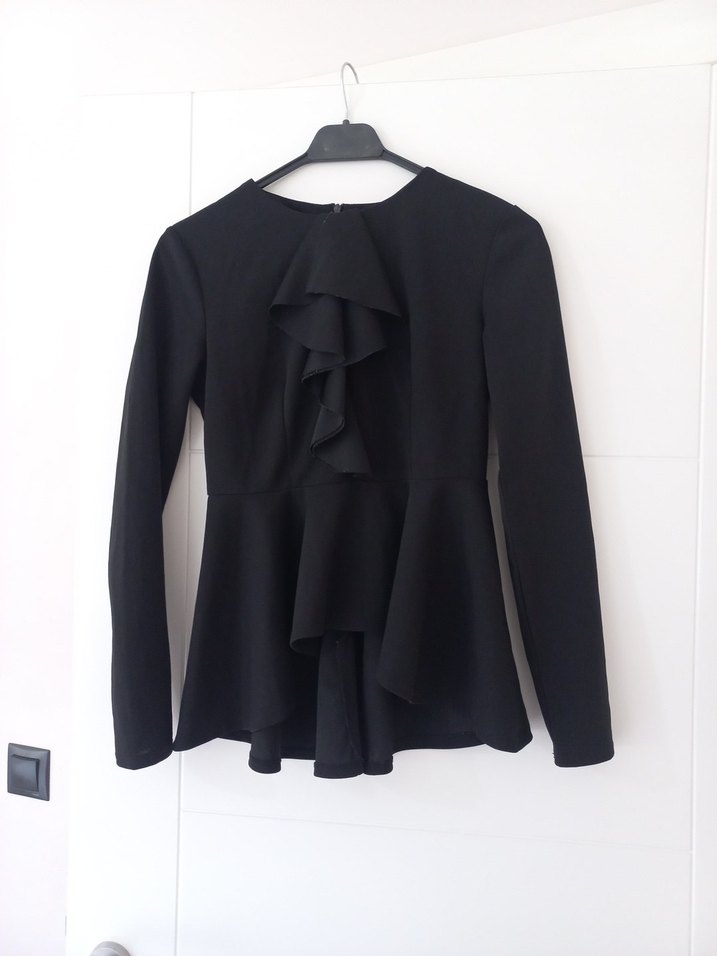Siyah, uzun kollu ve bisiklet yakalı bu bluz, sırt kısmında bele kadar fermuarı vardır. Düz kesimi ve sentetik kumaşıyla ofis için uygundur. Arka kısmı ön kısmından uzundur. S Beden. yurtdışından alındı