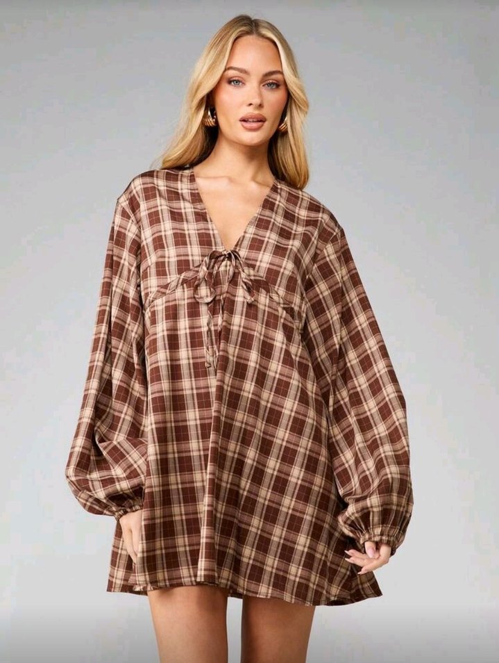 Shein missguided Kahverengi Ekose V Yaka kısa elbise