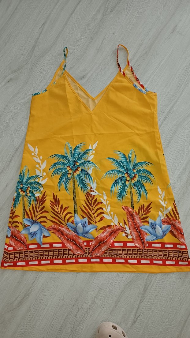 İNGİLTEREDEN ALINDI Sarı renkli, askılı, bol kesim mini elbise tropikal palmiye ve çiçek desenli, plajda kullanıma uygun drapeli tarzda.M beden