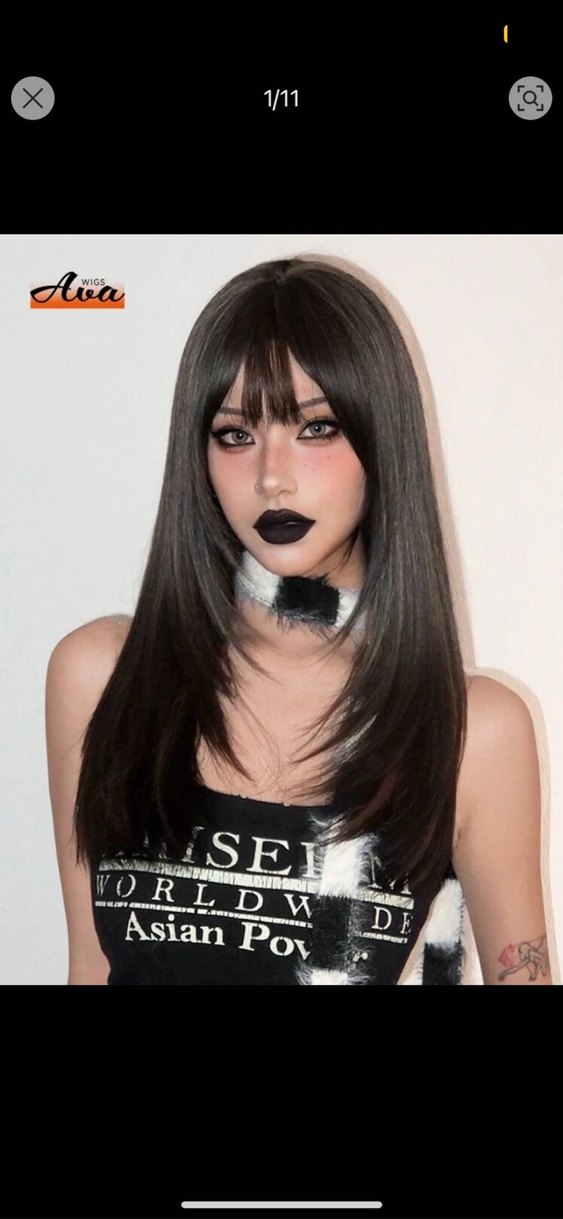 Uzun siyah sentetik kumaştan yapılmış, gotik punk tarzı kadın peruk. Koyu renk ve zahmetsiz şıklık sunar. Rock punk havası için ideal.