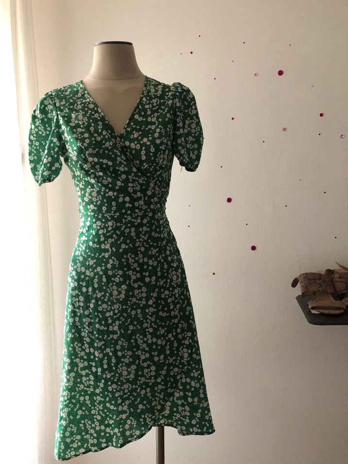 Yeşil renkli, V yakalı ve kısa kollu vintage midi elbise. Renkli desenli, drapeli ve vücuda oturan rahat kesim.