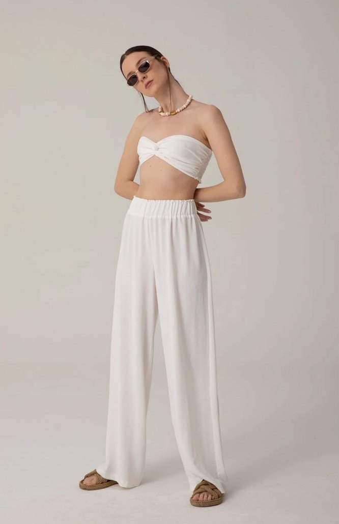 Beyaz keten kumaştan, rahat kesimli uzun kadın pantolonu. Minimalist ve normcore tarzıyla düğünler için şık ve rahat bir tercih. Etiketli yenidir