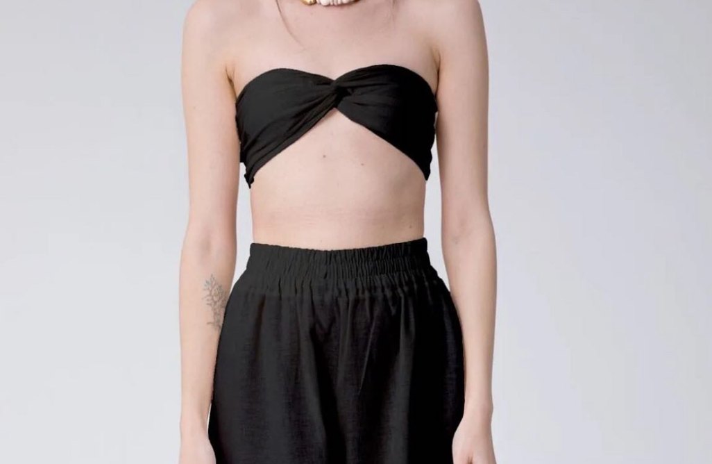 Siyah ketenstraplez bustiyer, ince askılı ve vücuda oturan kesimiyle günlük kullanımda zahmetsiz şıklık sunar. Minimalist gotik tarzıyla cesur bir görünüm sağlar.