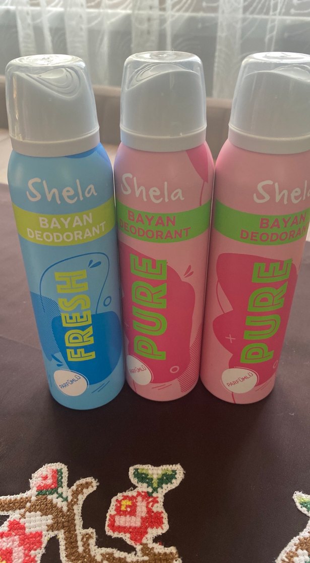 Shela bayan deodorantlar, fresh ve pure kokularıyla güvenli koruma ve hoş koku sağlar. Pakette iki pure, bir fresh çeşidi bulunur.