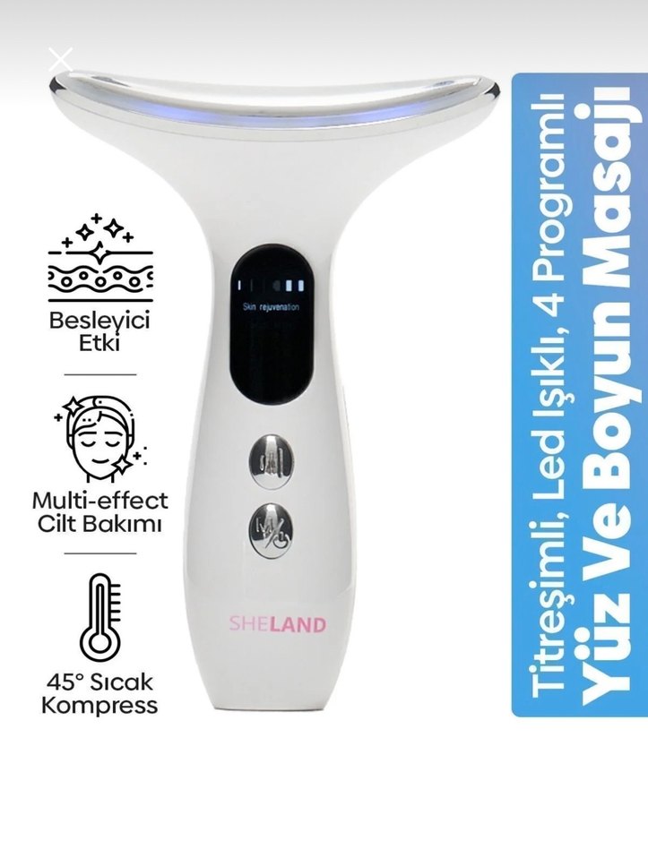 SHELAND yüz ve boyun masaj cihazı, besleyici etki, çoklu cilt bakımı, LED ışık, titreşim ve 45° sıcak kompres özellikleri sunar.