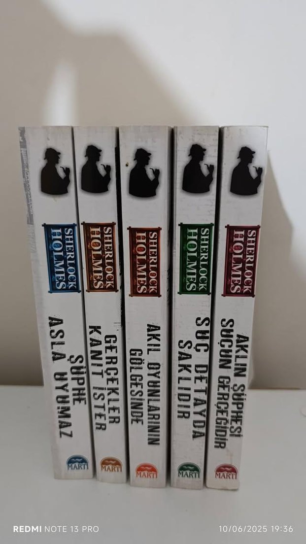 Sherlock Holmes'un beş kitabından oluşan set. Her kitapta suç detayları ve zeki akıl oyunları yer alır. Dedektiflik ve macera dolu hikayeler içerir. ️♂️
