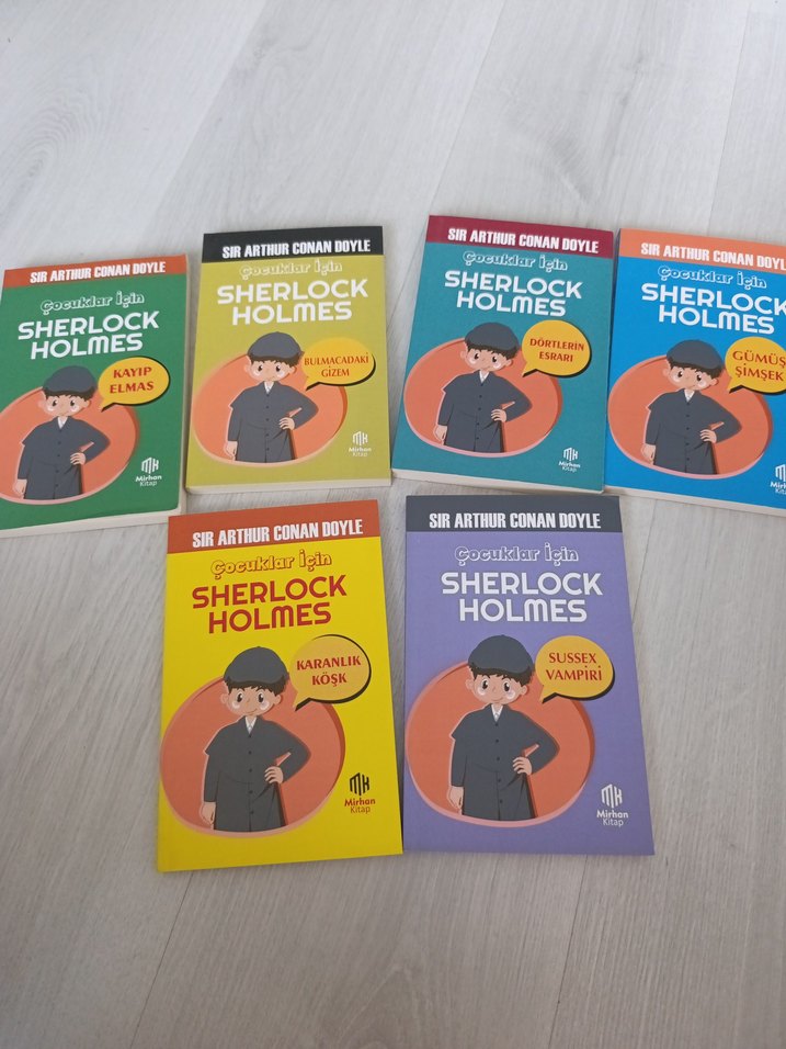 Sir Arthur Conan Doyle'un Sherlock Holmes hikayelerinin çocuklar için hazırlanmış 6 kitaplık seti, renkli kapaklı ve sade dilde.