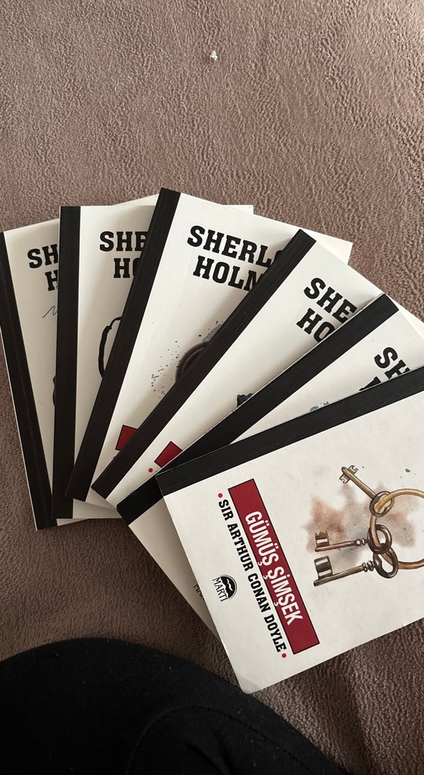 Sherlock Holmes hikayelerini içeren dedektif ve macera kitapları seti. Bir kitapta anahtar resmi bulunan sade kapak tasarımları. ️♂️