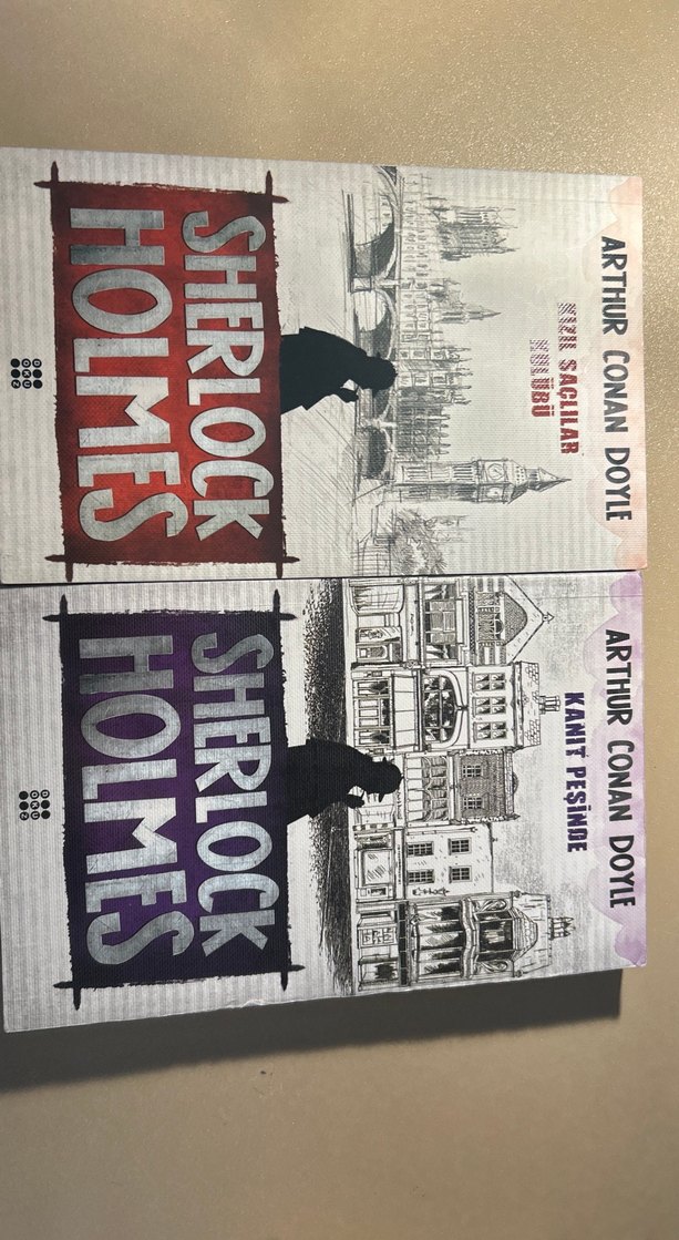 Arthur Conan Doyle'un Sherlock Holmes serisinden 'Kanıt Peşinde' ve 'Mızı Saçlılar' kitapları, klasik dedektif hikayeleri içeriyor. ️♂️