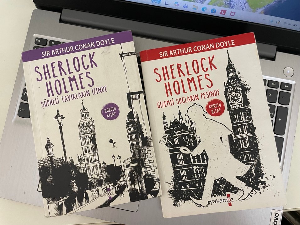Sir Arthur Conan Doyle'dan iki Sherlock Holmes kitabı, kokulu sayfalar ve gizemli suç hikayeleri içerir.