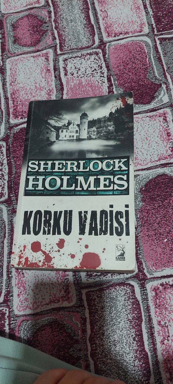 Sherlock Holmes'un 'Korku Vadisi' adlı polisiye kitabı, kan lekeleri ve kaleyle gizemli kapak tasarımına sahip. ️♂️