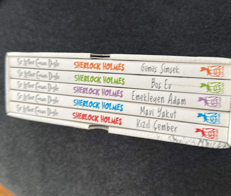 Sherlock Holmes dedektif kitapları seti, "Gumas Simsek," "Emekleyen Adam" ve "Mavi Yakut" gibi macera ve suç hikayeleri içerir. Çok temiz kullanılmış