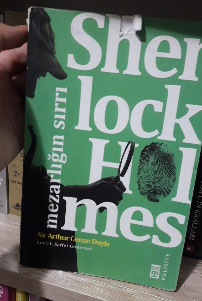 Sir Arthur Conan Doyle'un Sherlock Holmes Mezarlığın Sırrı adlı polisiye, suç ve macera kitabı. Çeviri: Saffet Gönersel. Kapakta Sherlock Holmes temalı parmak izi ve siluet yer alıyor.️