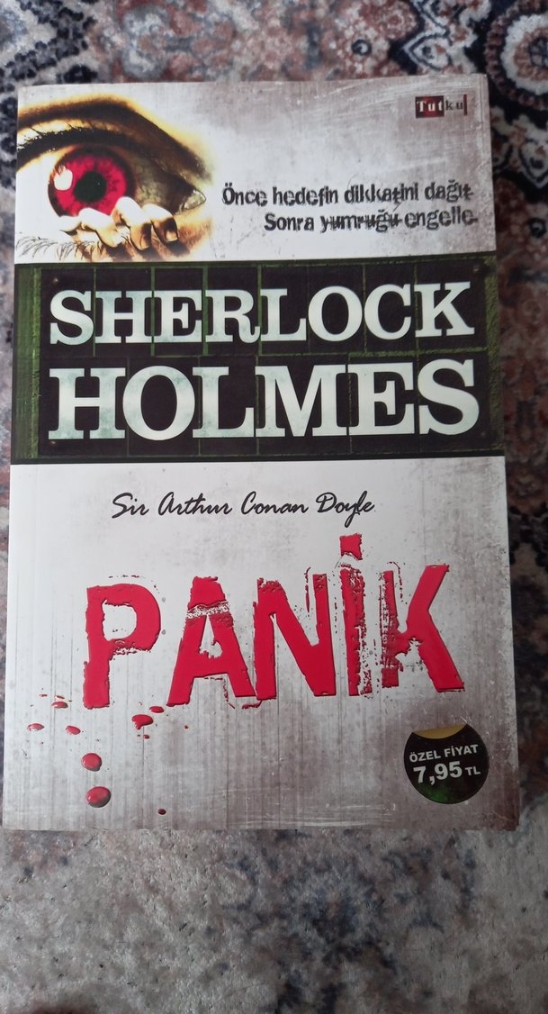 Sir Arthur Conan Doyle'un Sherlock Holmes Panik kitabı, sürükleyici bir dedektif hikayesi sunuyor. Kapakta "Önce hedefin dikkatini dağıt, sonra yumuşak engelle" ifadesi yer alıyor. Özel fiyat: