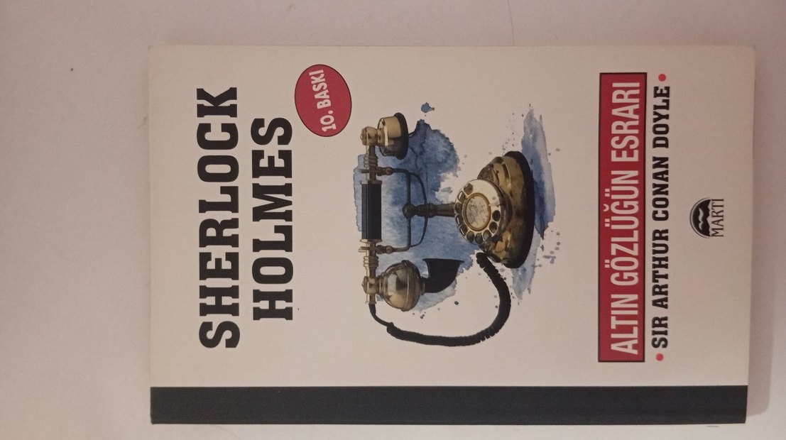 Sherlock Holmes romanı beyaz kapaklıdır ve üzerinde gri ve mavi tonlarda eski tip döner telefon resmi vardır. 10. baskıdır.