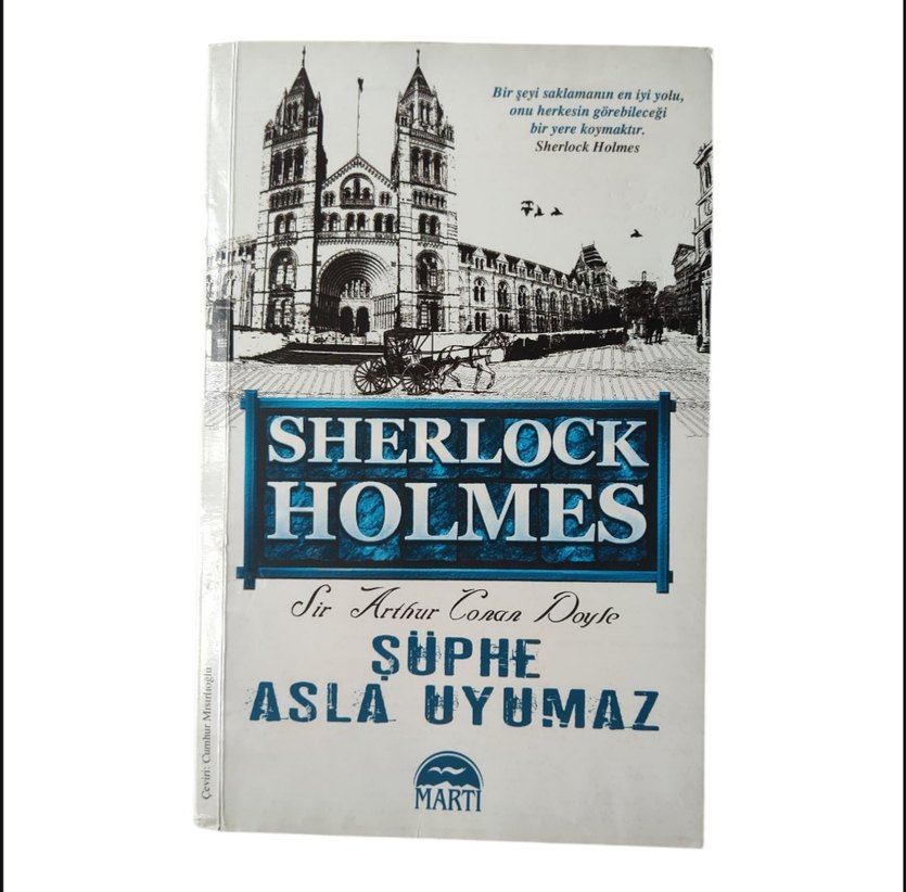 Sir Arthur Conan Doyle'un Sherlock Holmes kitabı, şüphenin asla uyumadığı bir dedektif hikayesi sunar. Kapakta tarihi bir bina çizimi ve Holmes'tan ünlü bir alıntı yer alır.
