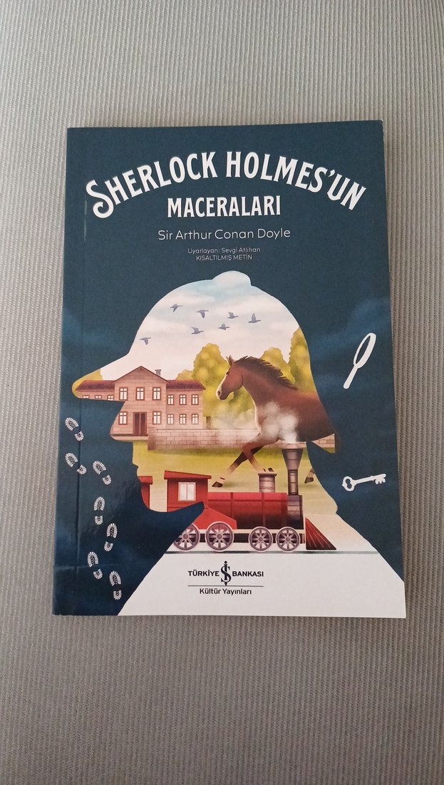 Sherlock Holmes'un Maceraları, Sir Arthur Conan Doyle tarafından yazılmış, büyüteç, at ve tren gibi simgelerle klasik dedektif hikayeleri içerir. ️♂️
